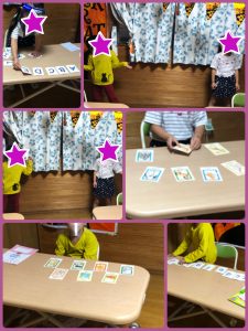 Super Star SongsのMother Gooney Birdは上手に歌えるようになりました!今日は新しい歌を紹介しました。と言っても馴染みのある Twinkle Twinkle Little Star.「きらきら星」です。「英会話たいそう」では”Do you know kendama?” “What is it?”を練習。練習しているとKTが”Do you know Sachiko?”などどんどん言い換えをしてくれました? From Head to Toeは自分が読めるページを読んでもらいました。2週間前あたりでは「読めるページがない」とべそをかいていたKTも「なんかいっぱい読める!」とどんどんと手を挙げて読みに挑戦。Good! 今日は絵本以外の動物も学びました。その動物がする動作も考えてみました。Funny Alphabetではどんどんアルファベットの文字が増えていきます。今日はKまで進みました。AからDまではわかるけれどだんだん混乱してきているようなMM。まずは音と文字に慣れることなので、大丈夫。色々なアクティビティで慣れていきましょう。