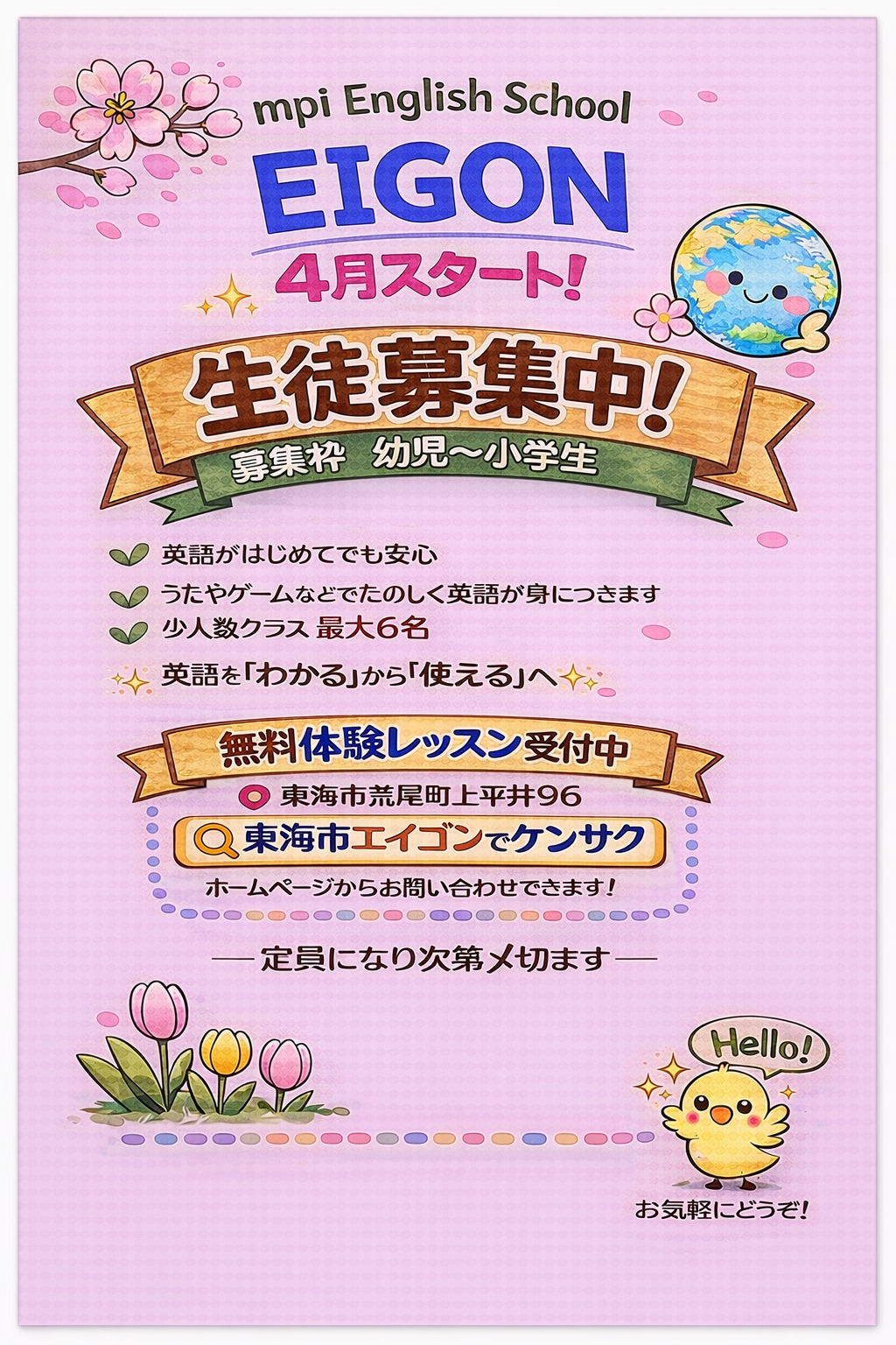 | 年中 | 土曜日 9:00~9:50 / 他の曜日応相談 | 募集中 |