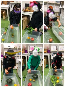 段ボールで作った見事な甲冑や帽子、その他可愛らしいキャラクターの衣装など
