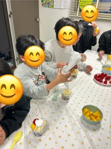 仲良くなったら、今年もみんなでフルーツパフェ作り。