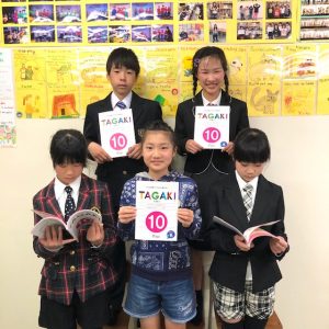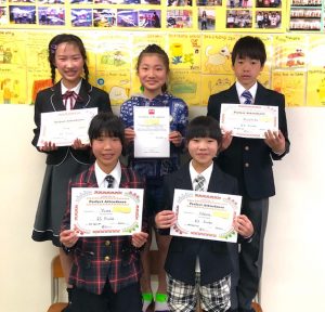 小学5,6年生の皆さんのクラスで、年度末の写真を撮りました。~Perfect Attendance賞、英検満点賞、Picabo通知表などを持って~
