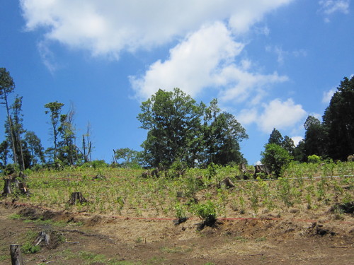 東北から九州まで日本のほとんどは常緑広葉樹が本来の本物の木で、(東海地域では海抜900mあたりまで)松や杉などの針葉樹はもちろん、落葉樹も残念ながら偽物の木。今回の植林地の山も2年前の台風で杉の木がなぎ倒された部分での植樹でした。