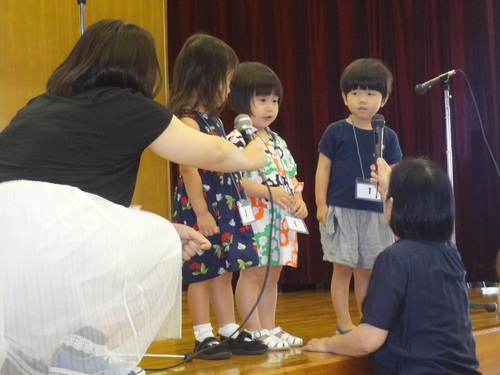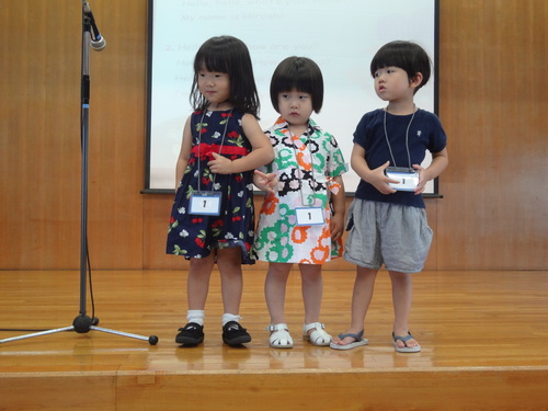 3人だけの発表でしたが、本当にしっかり英語が言えていました。いつもは、恥ずかしがり屋の男子1名、本当にがんばりました。 3人の声を届けたくて、必死でマイクを近づけました。次回は、お見苦しくないように工夫しますので、今回は、私の後ろ姿、お邪魔、おゆるしください。