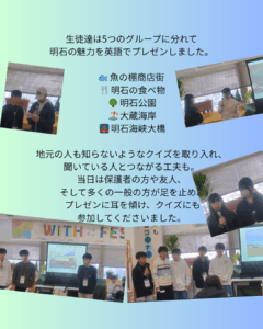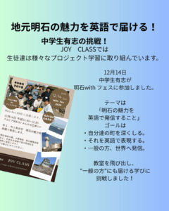 スクールBlog 202512月明石with フェスで英語でプレゼンをしました。 2026.01.04 記事一覧 2025 姫路インタビュー活動 2026.01.04 姫路Fieldtrip に行ってきました。 2024.11.18 8月24日 ウクライナ交流会 2024.09.01 卒業生インタビュー 2024.06.30 リピートーク4月結果発表! 2023.05.06 すべて見る 前の記事2025 姫路インタビュー活動 スクール紹介 クラス情報 お問い合わせ