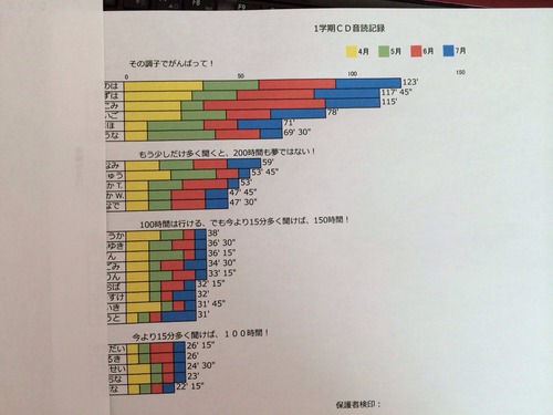さてさて、9年間カリキュラムのレベル1以上の生徒のみ、1学期間の「CD音読記録」のグラフ*
