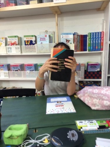 3枚目の写真は、教室に早く来たYOが私が使っていた英英辞典に興味を示し、自分も読もうとしてしてギブアップして辞書を閉じた瞬間です(笑)。