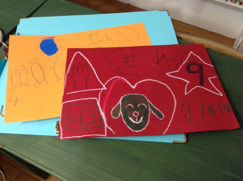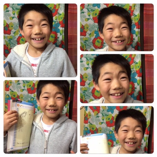 自己表現ワークは家族の絵を見せてスピーチを発表するのが宿題だったので、1人ずつやってもらいました。NIさん、絵はお父さんを描き、練習の時は感情が入っていませんでしたがそれもうまく入って合格です。DKくん、お兄さんが2人いて小さい方のお兄さんを絵に描きました。それで、This is my 2nd big brother.と練習してそれもうまく入って合格。ZIくんはお母さんを絵にして、故意にか間違いかThis is my father.とやって笑いを取ってから言い直して合格。そしてKSくん、お父さんを描いて、途中でストップ、他の子からSmile!!と掛け声が飛び、そこで見せてくれたのが写真の超ビッグ・スマイルです。全員、しばらく笑いが止まりませんでした。笑顔は全てを救う、ですね。実は、この後、泣き顔に早変わりし、野々村議員のモノマネとなりました。