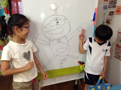 SとJの2人は、8/10の発表会には自作のスキットをする予定です。タイトルはWelcome to My House。これはWe Can!レベル2で最近やったばかりのトピックです。新旧の英会話たいそうの表現も使って2人で作ります。先ずは家の間取り図を描いています。Jは2週目で完成、Sは3週目の今日完成しました。