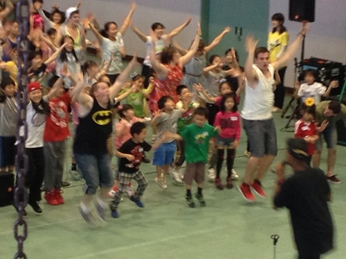 (写真1)手前左でバットマンのタンクトップを着て飛び跳ねてるのは一昨年ことばの広場3丁目に5日間ホームステイしたアンドリューくん、その隣のピンクの子がKちゃん、その隣のブルーのパンツがZくん、その隣の黄色とグリーンのTシャツがKくんです。みんなみんなJump, Jump, Jump!!! 一人まだ入り込めない子がいますが、キャストのお兄さんが一生懸命声かけをしています。
