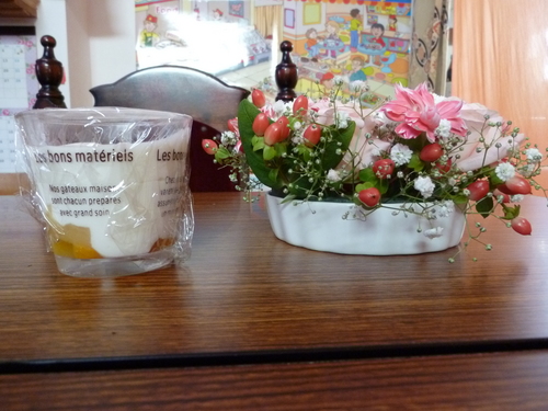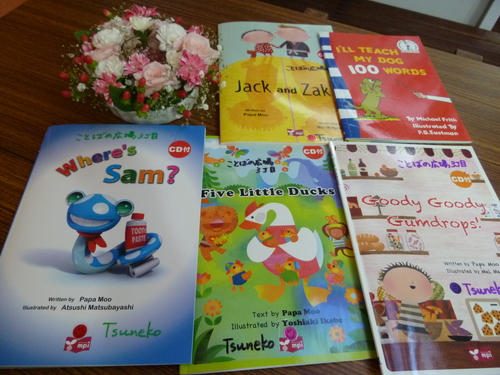 さてさて、絵本と一緒に写っているお花は、8さいのYくんが私の57回目の誕生日のために生けてくれたものです。ピンクのグラデーションと小さな赤い花との組み合わせがとても可愛いです。真ん中の赤いのはジェリーのようなキャンドルです。一緒に写っているスイーツは11さいのTくんお手製のフルーツババロアです。男の子二人がこのような形で祝ってくれたこと、感激一入です。男性がお花を生けてお菓子を作って女性を喜ばせる、素敵なことです。