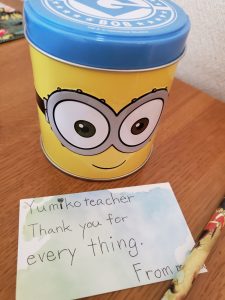 それぞれ、訪れた県の観光名所、特産物、日本一を誇れるものなど調べ、分かりやすく伝えられるよう地図やスライドを準備?1.5~2分位の内容でしたが、しっかり暗記して発表できました。Great!