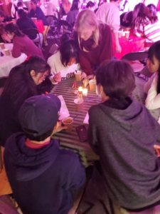 夕食にはピザ・手作りサラダ・カップケーキ・クッキーなどをほおばり、フリーの会話タイム・・・以前は緊張しすぎて食べられなかった子もいましたが、今年はそんな子はゼロ。同じテーブルの子たちと楽しそうに談笑。