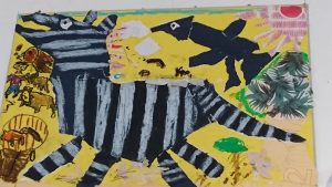 ちぎり絵で元気いっぱい駆け回るシマウマを表現したT君(小1)の作品です?
