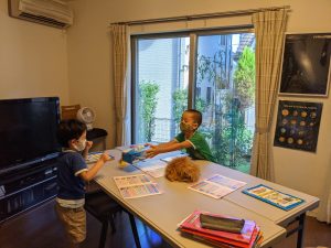 その後、児童英検5級の問題の絵カードを使って、動作の命令文のin putをやりました。初回ですので、丁寧に導入を行いました。6級までは動詞を単語単位で言えればOKですが、5級になりますと短いながらも文章で言えるようにします。11月の受験はお見送りのお話をしていますが、習得していただきたい内容に変わりはありませんので、しっかりinput →outputの練習をしていきます。