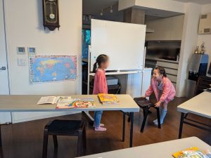 Polite vowels のルールの復習から。教本は、p54, 55, 56と進めました。文字カードは、音節に区切って読む練習をしました。