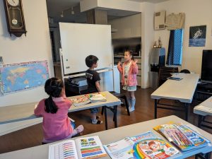 Polite vowels のルールの復習から。教本は、p54, 55, 56と進めました。文字カードは、音節に区切って読む練習をしました。