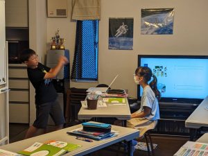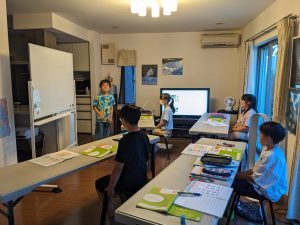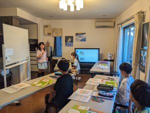 発表を終える毎に、聴き手側は3人称でreportをし、発言スタンプを競っています。その後、「書き取り」をしました。発表した内容をノートに書いてもらっています。