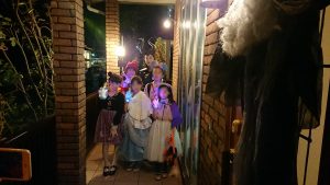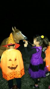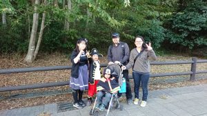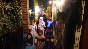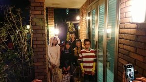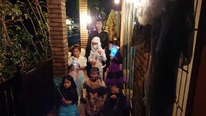 ☝手前の男の子さん、洋服をビリビリに破き、絵の具で血のりに見せている手の込んだ仮装です。隣のお母様もなんて素敵なBlack catなんでしょう!去年に引き続き、partyの盛り上げ演出ありがとうございます。